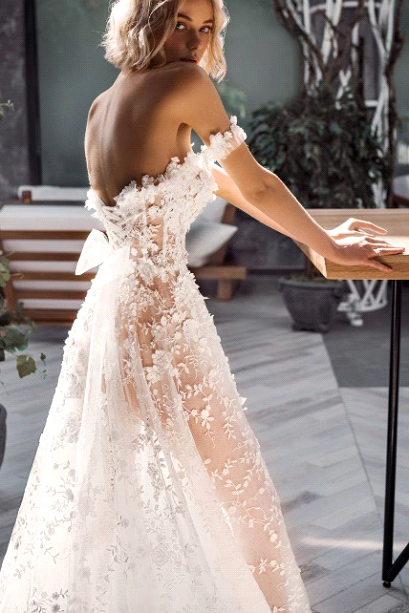 - Модели с кружевными элементами: рукава, бюстье, спина подчеркнут изящество и хрупкость. Добавят нежности в образ