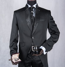 Свадебный костюм может быть любого цвета и фасона, но все же предпочтение отдается классическому смокингу, в особых случаях фрак, а также хит свадебного сезона – пиджак выполненный из ткани жакарт и атласные брюки черного цвета. Аксессуары к свадебному костюму позволяют современному жениху проявить фантазию и чувство вкуса. Новые тенденции диктуют: аксессуар должен подчеркивать благородство и исключительность случая, к примеру, запонки из благородного белого металла с черными камнями от Swarovski, бабочки, жабо и кушаки.
