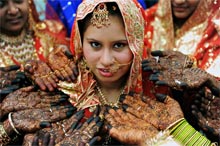 Индийская мусульманка и руки ее подруг, украшенных росписью менди перед началом массовой церемонии бракосочетания в Ахмедабаде.