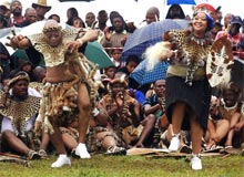 Президент Южной Африки Джейкоб Зума поет и танцует со своей новой женой Тобекой Мадибой на церемонии бракосочетания в ярких свадебных костюмах в поселке Нкандла.