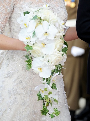 Каскадный букет невесты был создан флористами из Lachaume Fleurs и состоял из бледно-желтых роз и белых орхидей. Во время церемонии невеста возложила его к образу Богоматери, и он остался в соборе.