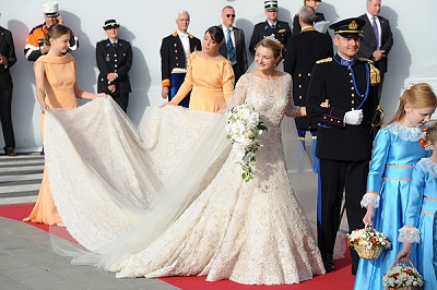 Лишь когда невеста ехала в собор, был выпущен официальный пресс-релиз, рассказывающий, что будущая супруга наследного принца Люксембурга доверила честь создания своего свадебного платья ливанскому дизайнеру Эли Саабу.