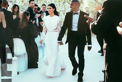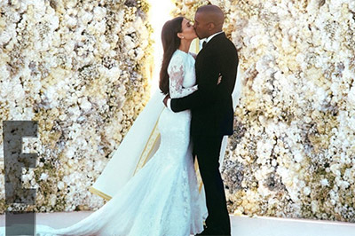 Вопреки ожиданиям, свадьба звезды реалити-шоу и рэпера была очень классической — на невесте белое платье в пол и длинная фата, а жених одет в строгий фрак. Словом, Кардашьян и Уэст на этот раз решили не шокировать общественность. На первом официальном снимке из свадебного альбома они изображены целующимися на фоне стены из белых роз. Похоже, что эта цветочная стена была одной из главных «достопримечательностей» свадьбы Ким — она выложила сразу несколько подобных фотографий в личном блоге.