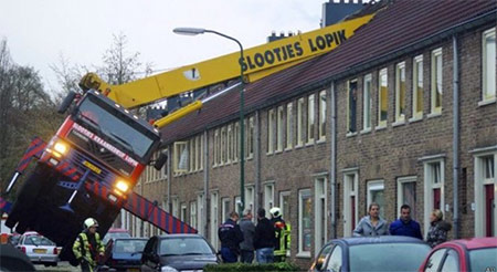 Житель города Эйсселстейн в центральной части Нидерландов задумал подъехать к дому возлюбленной на автокране, опуститься на крючке к окну ее спальни, спеть ей песню и сделать предложение. Но кран не был должным образом закреплен, опрокинулся и при этом проделал дыру в крыше соседнего дома.