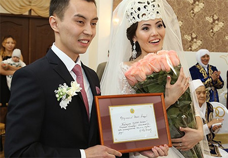 От имени президента страны аким области вручил молодоженам подписанное собственноручно президентом поздравление, большой плазменный телевизор, а невесте — большой букет роз.