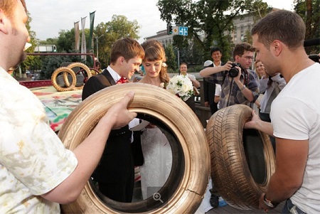Во время свадьбы на СТО невеста не кидала букет. К нему был прикреплен болт, а подружкам вынесли гайки. И только одна гайка подошла. Даже свои кольца молодожёны нашли в автомобильных колесах, торжественно вынесенных к месту регистрации. А гости ко всеобщей радости обнаружили под капотом УАЗа барную стойку. Этикетки на бутылках гласили, что внутри "Антифриз" и "Автошампунь", но, как показала дегустация, под этими названиями были замаскированы вино и шампанское.