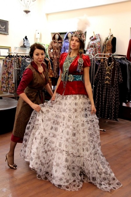 На этапе выступления в национальных костюмах она предстанет перед жюри в платье от дизайнера Аиды Кауменовой.