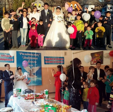 С администрацией детского дома он договорился заранее. А дети в это время готовились к празднику. Сауранбек отмечает, что он преследовал лишь три цели: подарить детям радость, избежав пустых трат, показать сиротам, лишенным родительской заботы, настоящий той и заняться благотворительностью. Молодой человек говорит, что дети были очень рады такому событию, ведь они никогда не видели невесту в белом платье.