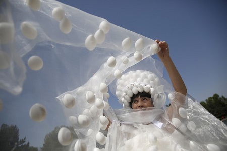 Возможно, платье было приурочено и еще к одному событию. На этой неделе вышел сборник стихов Кун Нин. В одном из стихотворений дизайнер и поэтесса написала о тысяче яиц. Кстати, в декабре 2015 года китайский дизайнер уже отметилась похожим способом. Тогда Кун Нин создала свадебное платье из респираторных масок и прошлась в нем по улицам Пекина в знак протеста против загрязнения воздуха.