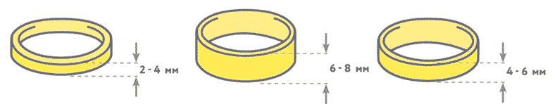 Толщина комфортного в ношении обручального кольца не должна быть более 2,5 мм, в противном случае изделие будет доставлять дискомфорт, оказывая давление на соседние пальцы. Очень узкие модели – до 1 мм легко поддаются деформации. Стоит выбирать оптимальные по толщине – от 1 до 2,5 мм.